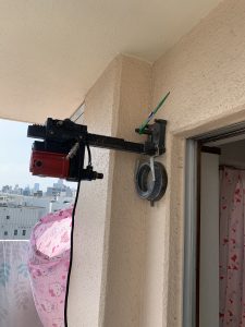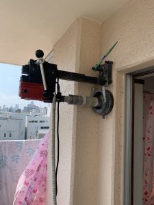 コンクリート造ですので普通のドリルにコアつけてもなかなか開ける事難しいので、本日は湿式タイプの設置型のコア抜きを使っての穴あけ工事になります。